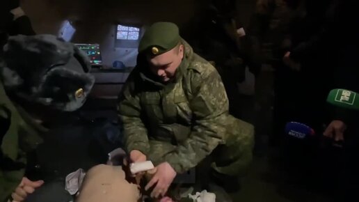 Инструктор по обучению медицинским навыкам показывает как мобилизованные тренируются на роботе