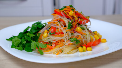 Быстрый салат с фунчозой и овощами. Простой, но какой вкусный! Хорош как на праздничный, и на повседневный стол. Делюсь рецептом.
