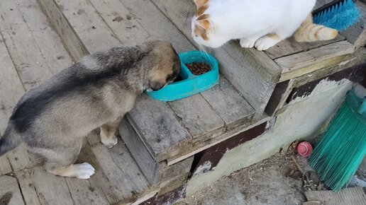 Щенок ворует вкусняшки у кота 😄