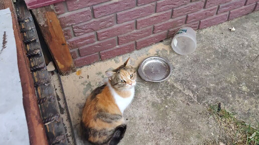 Только приехали на дачу, а чужая кошка уже нас встречает, мурлыкает и трется об одежду чтобы ее погладили и покормили. Животное соскучилось