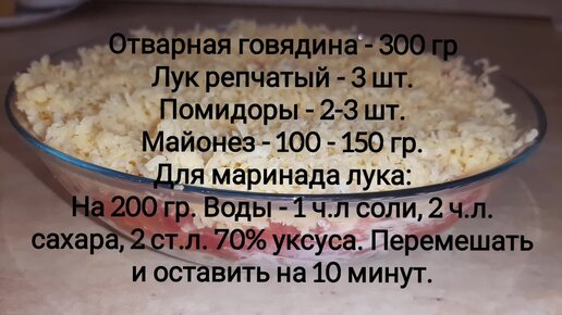 Мужской салат. Сытный и оригинальный салат с отварной говядиной, маринованным луком, помидорой и сыром