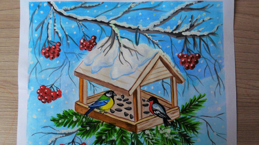 Как нарисовать кормушку - рисуем зимний денек и птичек.