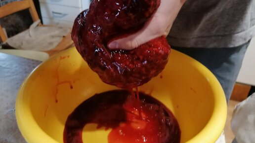 Ягоды Лимонника Китайского, отжимаем сок через сеточку для желе на зиму.