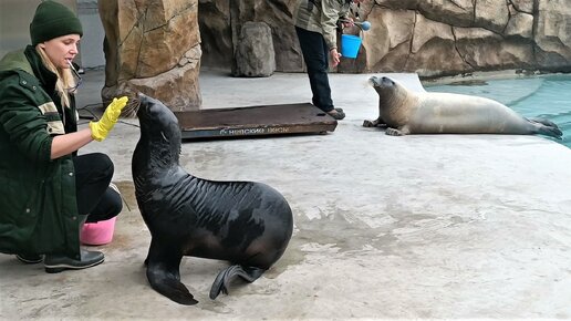 Показательное кормление морского котика и морского зайца в Московском зоопарке.