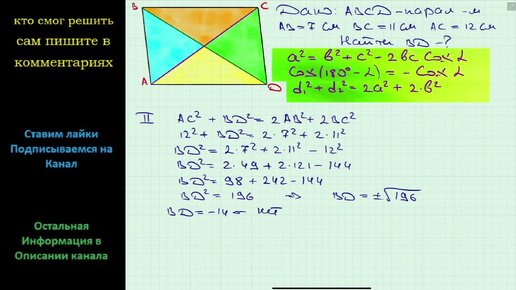 Геометрия Две стороны параллелограмма равны 7 см и 11 см, а одна из диагоналей 12 см. Найдите вторую диагональ параллелограмма.