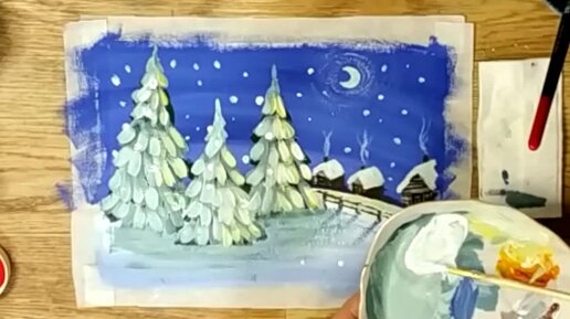 Зима Ёлки Как нарисовать зимний пейзаж гуашью. Paint a winter landscape