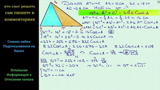 Геометрия Стороны треугольника равны 16 см, 18 см и 26 см. Найдите медиану треугольника, проведенную к его большей стороне