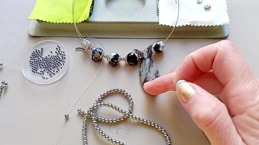 Колье из бело-чёрного и серого агата и необычные,стильные серьги.