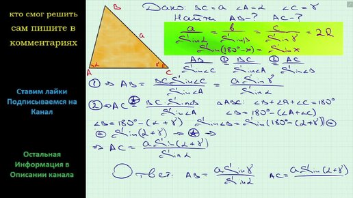 Геометрия В треугольнике ABC известно, что BC = a, угол A = α, угол C = γ. Найдите стороны AB и AC