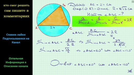Геометрия Сторона треугольника равна 24 см а радиус описанной окружности 8√3 см Чему равен угол треугольника противолежащий данной стороне?