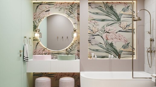 Дизайн интерьера ванной комнаты для двоих девочек-сестер, в нежной нюдовой гамме