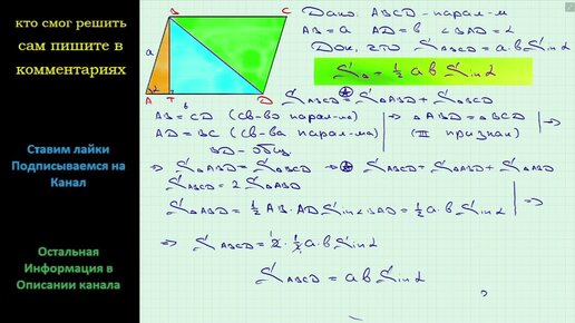 Геометрия Докажите, что площадь параллелограмма можно вычислить по формуле S = abSinα