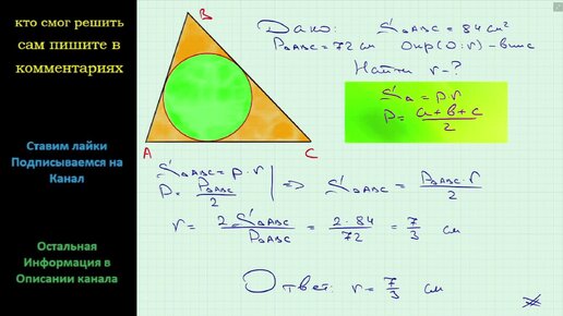 Геометрия Площадь треугольника равна 84 см2, а его периметр 72 см. Найдите радиус окружности, вписанной в треугольник