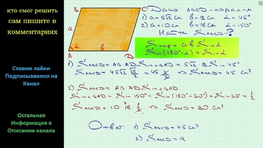 Геометрия Найдите площадь параллелограмма по его сторонам a и b и углу α между ними если: 1) a = 5√2 см b = 9 см α = 45 2) a = 10 см b = 18