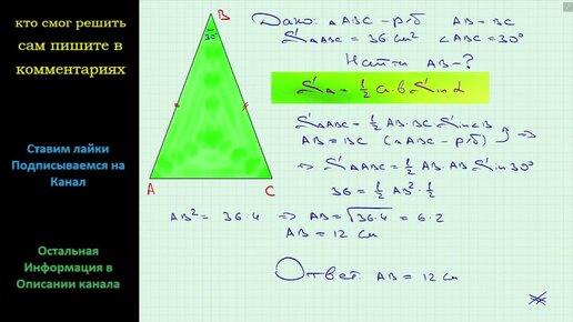 Геометрия Найдите боковую сторону равнобедренного треугольника, площадь которого равна 36 см2, а угол при вершине 30