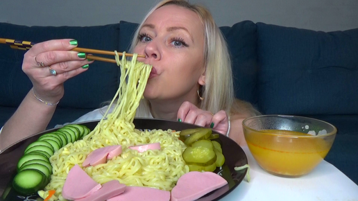 Лапша Чан Рамен, огурцы бочковые. Колбаса. Еда.