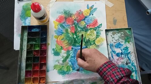 Акварельная мастерская Сергея Галеты. Знакомство с доработкой в монотипии. Доработка монотипии "Цветы" художника Юлии Пискуновой Часть 2.
