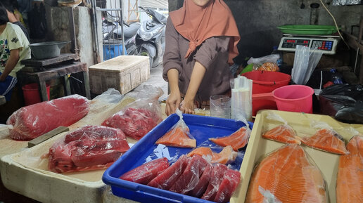 Главный рыбный рынок на Бали в Джимбаране. Разнообразие морских деликатесов и самая обаятельная их продавщица.