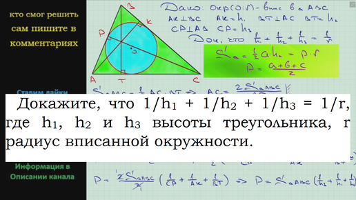 Геометрия Докажите, что 1/h1 + 1/h2 + 1/h3 = 1/r, где h1, h2 и h3 высоты треугольника, r радиус вписанной окружности