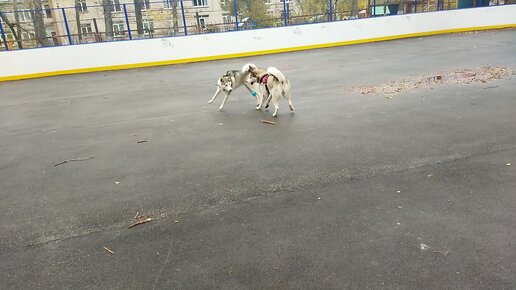 Хаски и маламут бегают без поводков.