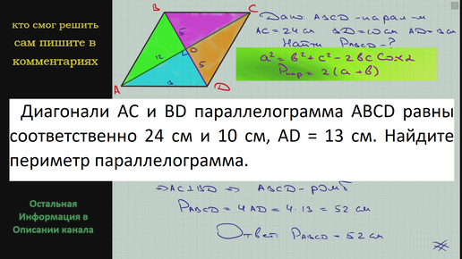 Геометрия Диагонали AC и BD параллелограмма ABCD равны соответственно 24 см и 10 см, AD = 13 см. Найдите периметр параллелограмма