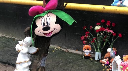 К дому выброшенной с 11-го этажа девочки несут цветы и игрушки