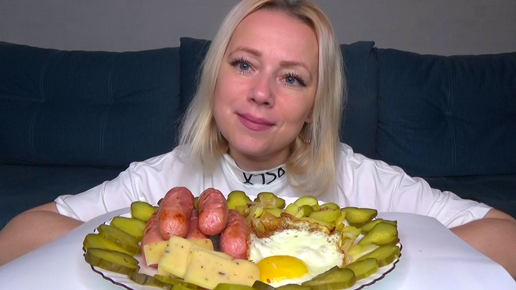 Жареные яйца, вкусные сосиски, картошка отварная в мундирах. Огурцы бочковые.