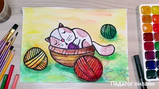 Рисование для детей. Озорной котик и клубочки. Рисуем акварелью и фломастерами