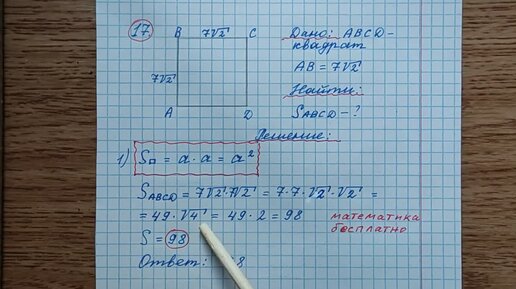 15) Сторона квадрата равна 7√2. Найдите площадь квадрата. ОГЭ математика 2023. Математика бесплатно.