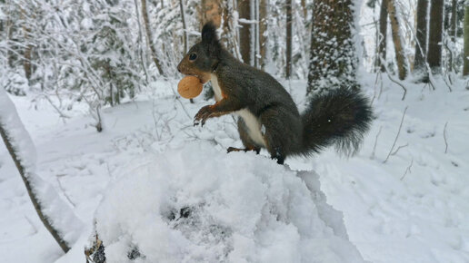 Голодная белка прибежала за орешками по сугробам