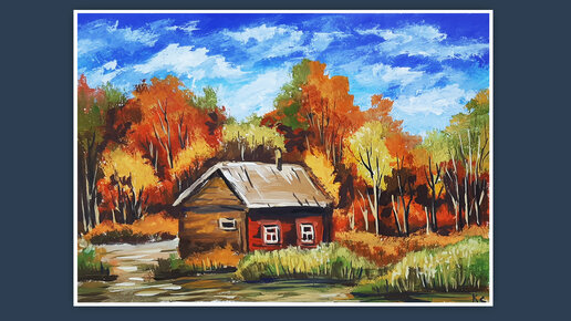 Взяла щетинную кисть и нарисовала осень. Домик у реки, осень гуашью.