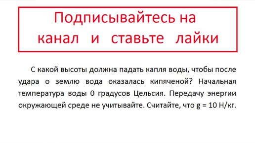 Физика С какой высоты должна падать капля воды, чтобы после удара о землю вода оказалась кипяченой? Начальная температура воды 0 градусов