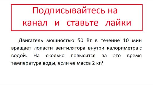 Физика Двигатель мощностью 50 Вт в течение 10 мин вращает лопасти вентилятора внутри калориметра с водой На сколько повысится за это время