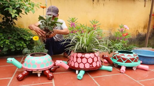 Переработка пластикового умывальника в цветочные горшки в форме черепахи ЧАЙНЫЙ сад