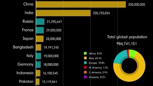 Интересная визуализация, которая показывает, как менялось население самый крупных стран мира начиная с 1800 года и как оно будет увеличиваться до 2100 года