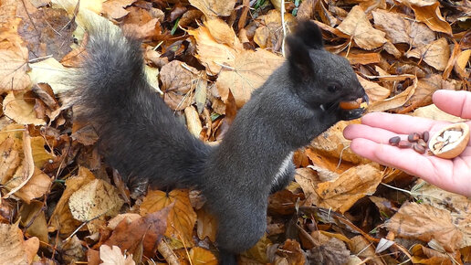 Смешной пушистый уголек! Черноглазая красотка белочка весело шуршит в опавших листьях.