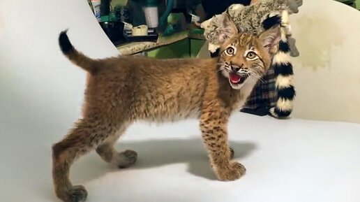 Рысь Ханна играет с лемуром и медведем, пока её фотографируют