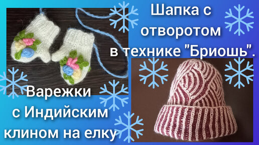 Шапка с отворотом в технике "Бриошь". Варежки с Индийским клином на елку.