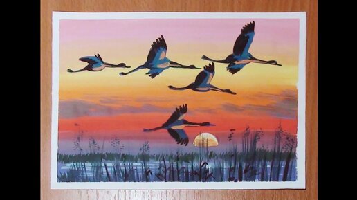 Журавли. Как рисовать птиц гуашью легко, поэтапно. Подробный обучающий урок для начинающих