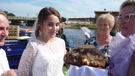Свадьба на теплоходе. Мамы благославляют молодых и угощают караваем