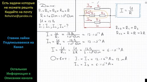Физика Найдите силу тока в каждом из резисторов (рис.). К цепи приложено напряжение 12 В, сопротивление каждого резистора 1 кОм