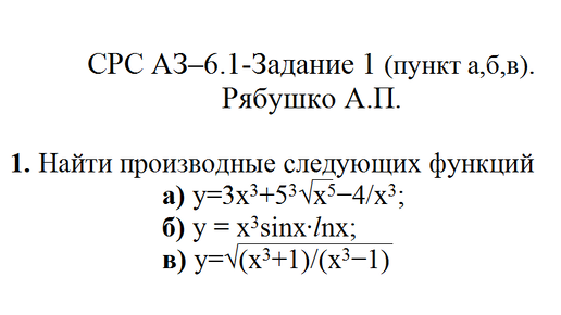 Найти производные следующих функций а) у=3x^3+5^3√x^5−4/x3; б) y=x^3sinx∙lnx; в) y=√(x^3+1)/(x^3−1) СРС АЗ 6.1-Задание 1 (а,б,в) Рябушко А.П