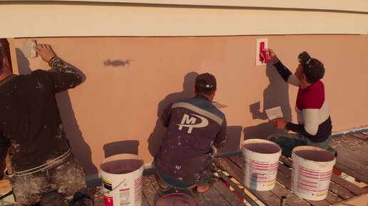 Нанесение камешковой декоративной штукатурки Ceresit на фасады, утеплённые ППС16ф. Нанесение металлической тёркой, затирание пластиковой