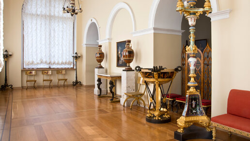 Предметы интерьера личных покоев им-й семьи. Курительная комната в восточном стиле,подсвечник оригинальной формы, коллекция оружия с Востока