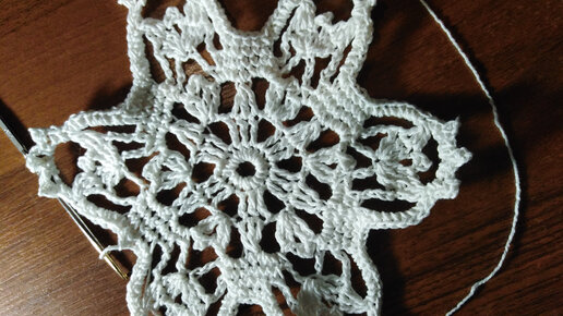Вяжем крючком снежинку № 2, как украшение на елку, как подставка на стол
