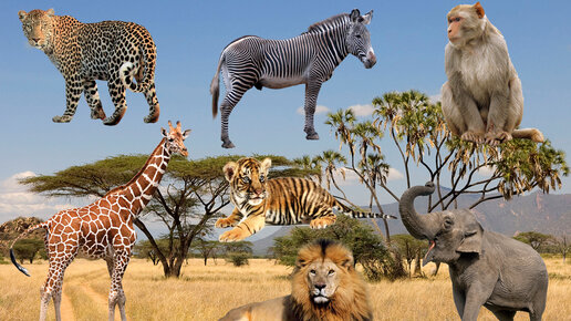 Животные Африки: жираф, слон, тигр, обезьяна, лев, зебра - Звуки животных