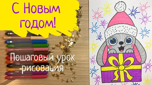 Рисунки на новый год Легкие новогодние рисунки Новогодний кролик рисунок Новогодняя открытка рисунок. Карандаши и краски.