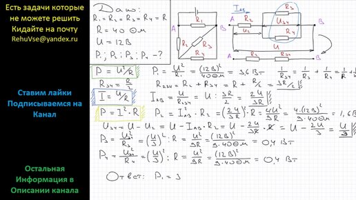Физика Какова мощность тока в каждом из резисторов (см. рис.), если напряжение на источнике тока 12 В, а сопротивление резисторов R1 = R2