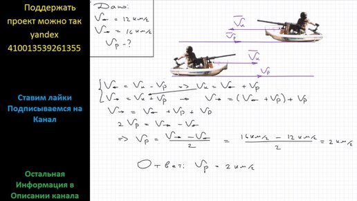 Физика Катер движется по реке против течения со скоростью 12 км/ч относительно берега, а по течению – со скоростью 16 км/ч. Какова скорость