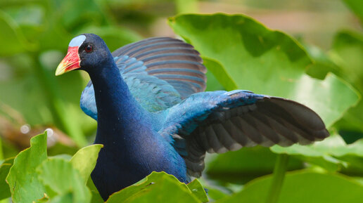 Малая султанка - птица с двуцветным клювом и ярким оперением